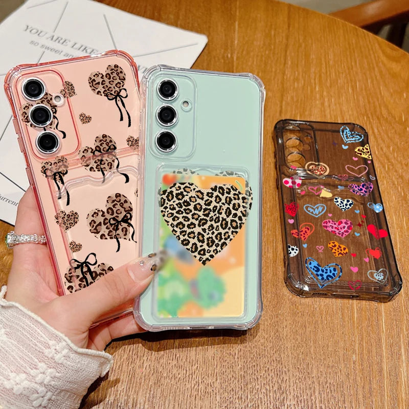 Card Pocket TPU Phone Case For Samsung Galaxy S25 S24 S23 Ultra S24 S23 S25 FE S22 Plus Leopard Print Love Heart Pattern Cover