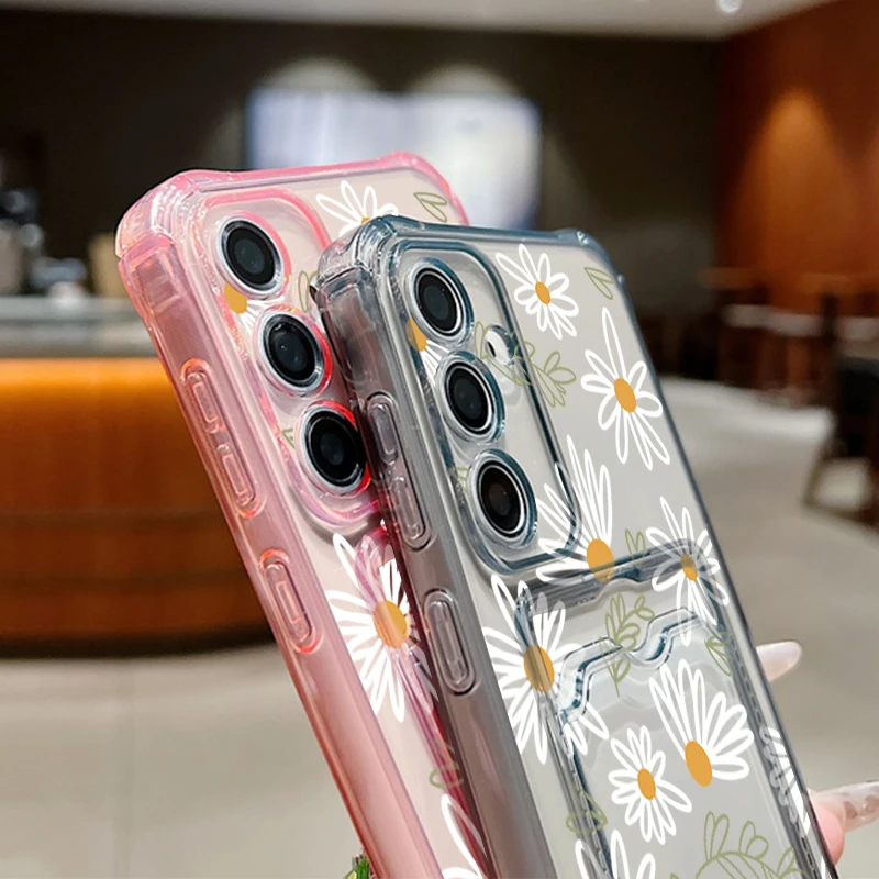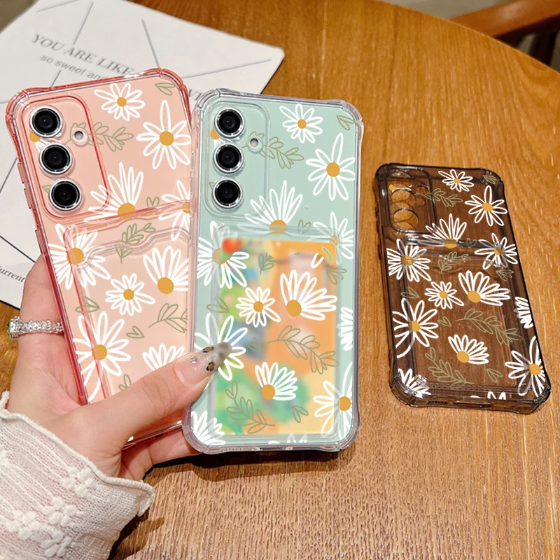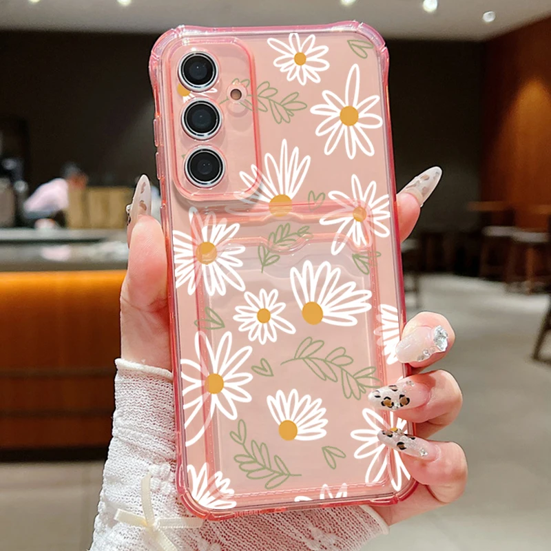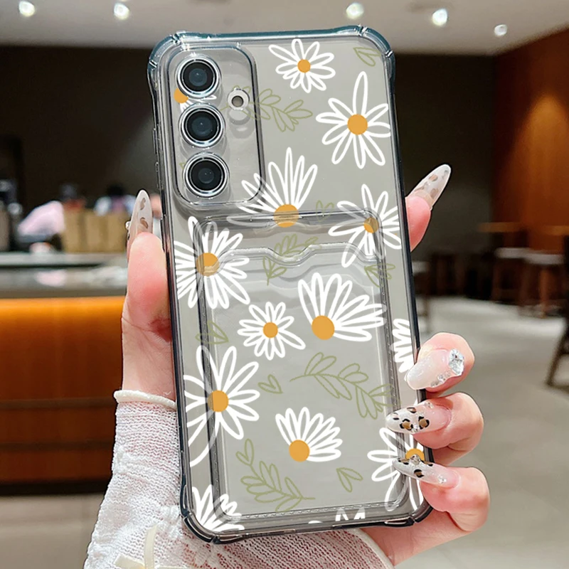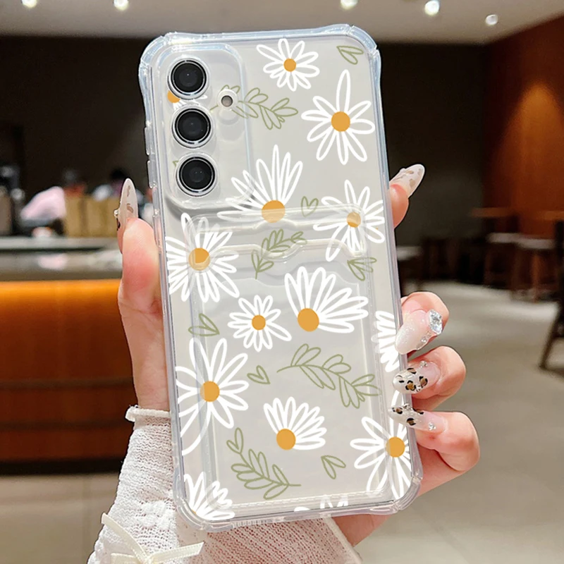 Card Slot Pocket Case For Samsung Galaxy A56 A55 A25 A16 A15 A36 5G S25 Edge S24 Ultra S23 S24 FE Cartoon White Flower TPU Cover