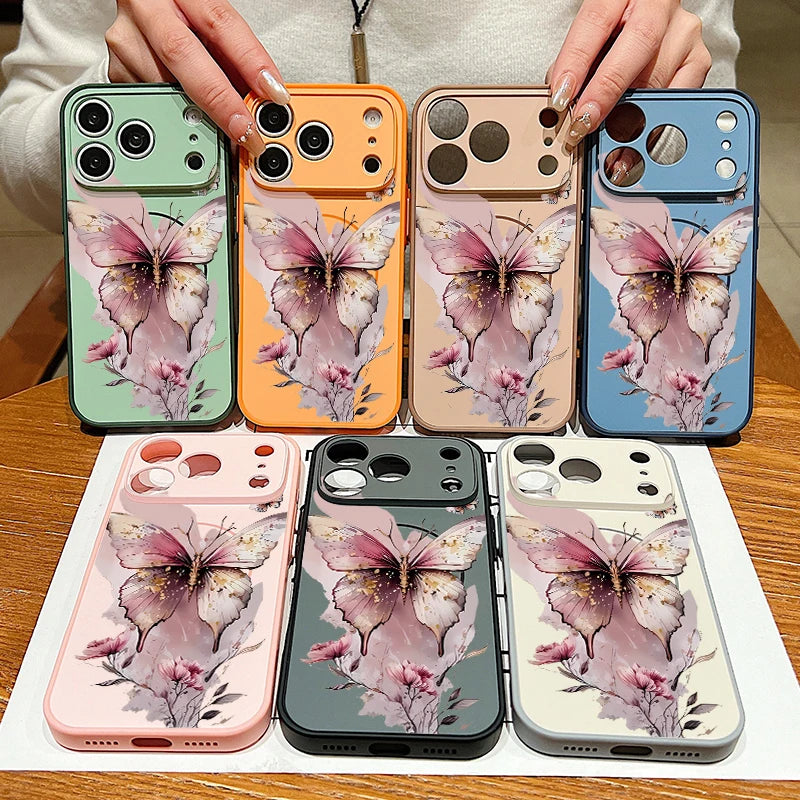 Magnetic Phone Case For iPhone 17 Pro 16 15 14 13 Pro Max For Magsafe Wireless Charge Pink Butterfly Print Hard PC Back Cover